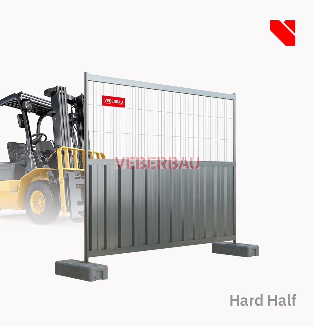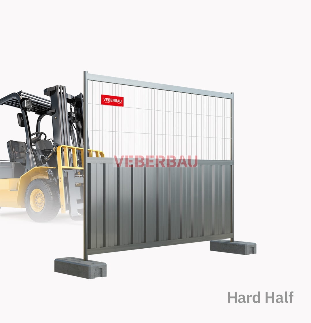 Ogrodzenia budowlane Hard Half 2,3 m marki VEBERBAU zbudowane są z solidnej rurowo-profilowej ramy, która jest wypełniona w dolnej części blachą trapezową (tak jak ma to miejsce w typowych ogrodzeniach budowlanych pełnych), a w górnej - stalową siatką z gęstym oczkiem, którą stosuje się w panelach ażurowych typu "anticlimb". To pośrednia ("lżejsza") forma ogrodzenia ochronnego, które w ramach jednej struktury łączy zalety, którymi charakteryzują się ogrodzenia budowlane ażurowe oraz ogrodzenia budowlane pełne.